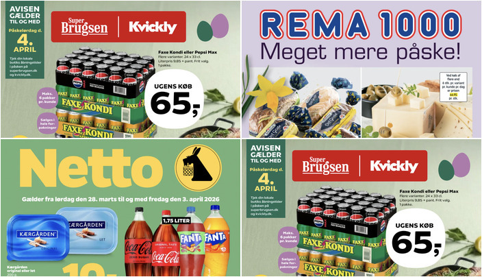 Rema 1000 tilbyder Pepsi Max eller Faxe Kondi til kun 9 kr. for 1,5 liter. Dette tilbud gælder fra søndag 29. marts til lørdag 4. april.